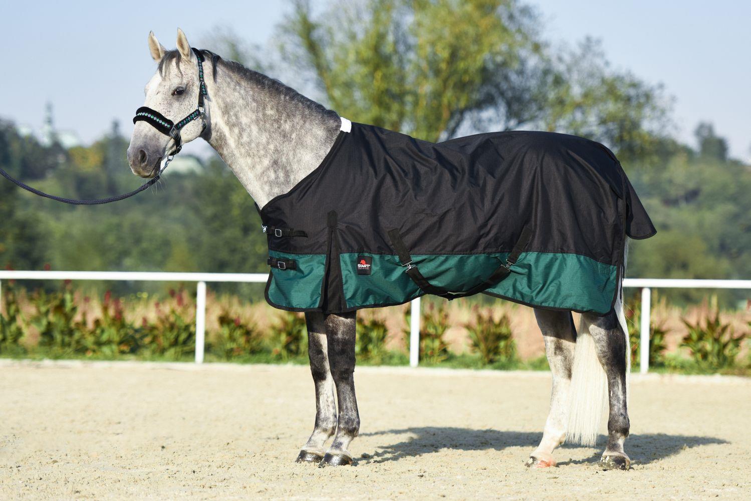 Derka, która świetnie sprawdzi się w czasie deszczowych dni. Wykonana jest z wodoodpornego, oddychającego materiału RipStop o gramaturze 600 DEN. Podszyta jest przyjemnym w dotyku polarem. Posiada podwójne paski umożliwiające szybkie zapięcie oraz stabilną regulację. Rozcięcia materiału na łopatkach zapewniają swobodę ruchów, a pasy krzyżowe zapobiegają zsuwaniu się derki. Zawiera podszycie z futerkiem na kłębie i klapę na ogon. Posiada również pasy na nogi z możliwością odpięcia. Derka bez wypełnienia, posiada naszywkę z logo firmy “Start”. Komfortowa i praktyczna!