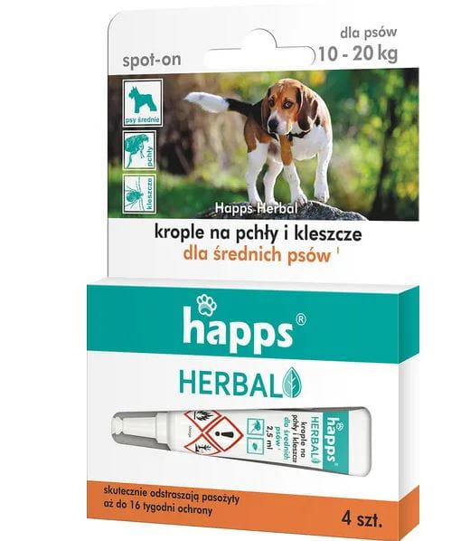 - wygodne i łatwe w użyciu krople HAPPS HERBAL to preparat do odstraszania pcheł i kleszczy, które aplikuje się bezpośrednio na skórę psa