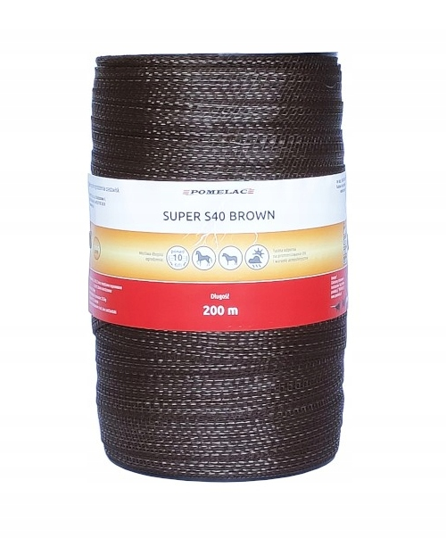 Taśma brązowa SUPER S40 BROWN o szerokości 40 mm i długości 200 metrów. Idealna dla koni i kuców. Bardzo wysoka przewodność i trwałość. Doskonała przewodność i długowieczność w przypadku średnich i długich ogrodzeń. Bardzo mocna i solidna taśma służąca do budowy ogrodzeń elektrycznych. Odporna na niszczące działanie słońca i warunki atmosferyczne. Super przewodność prądu i wytrzymałość na zerwanie.