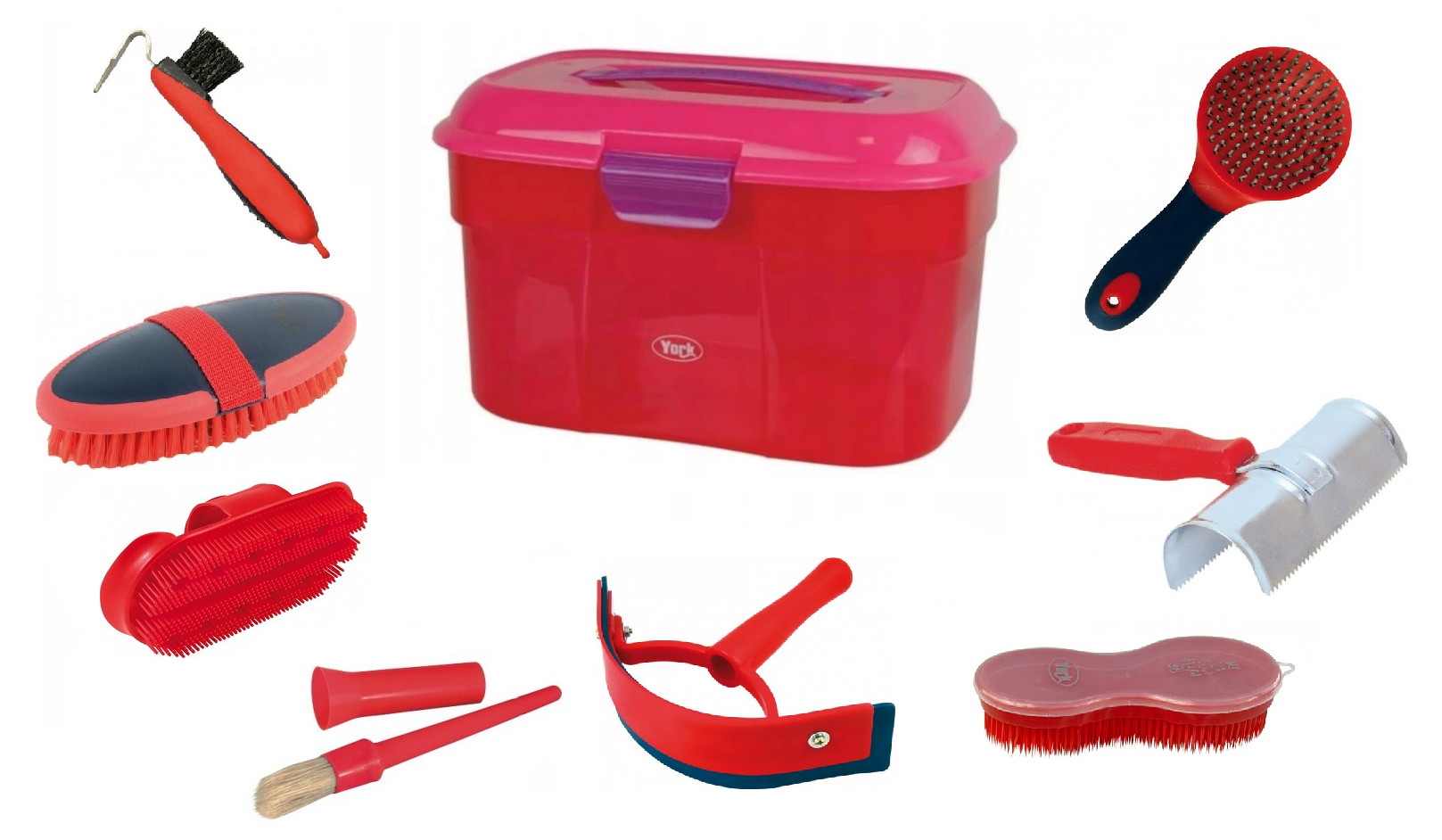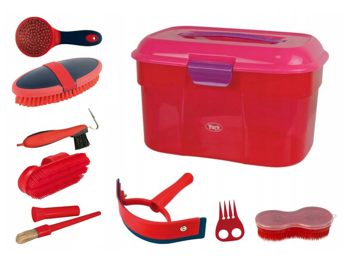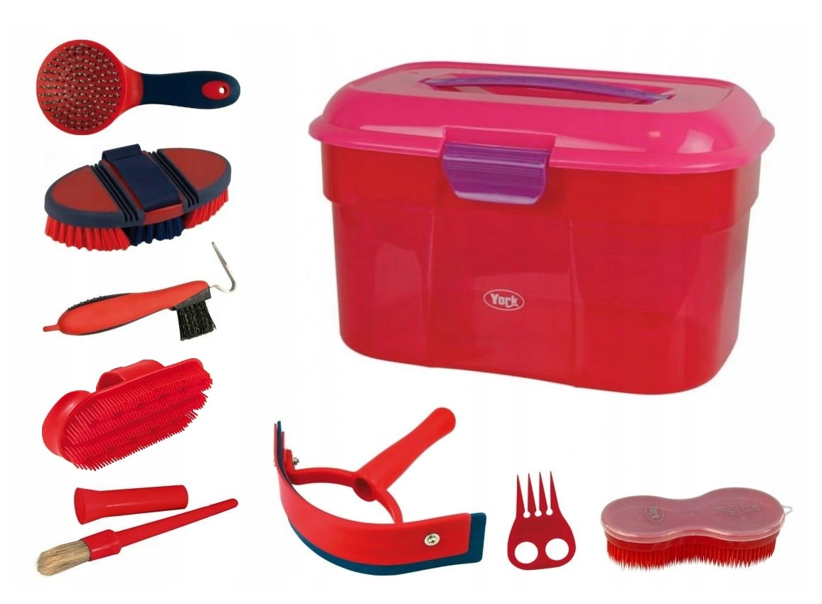 - w zestawie: skrzynka, szczotka do sierści, szczotka do grzywy i ogona, szczotka na gumki Magic Box, zgrzebło plastikowe,zgrzebło podwójne, ściągaczka do wody, pędzelek, kopystka,